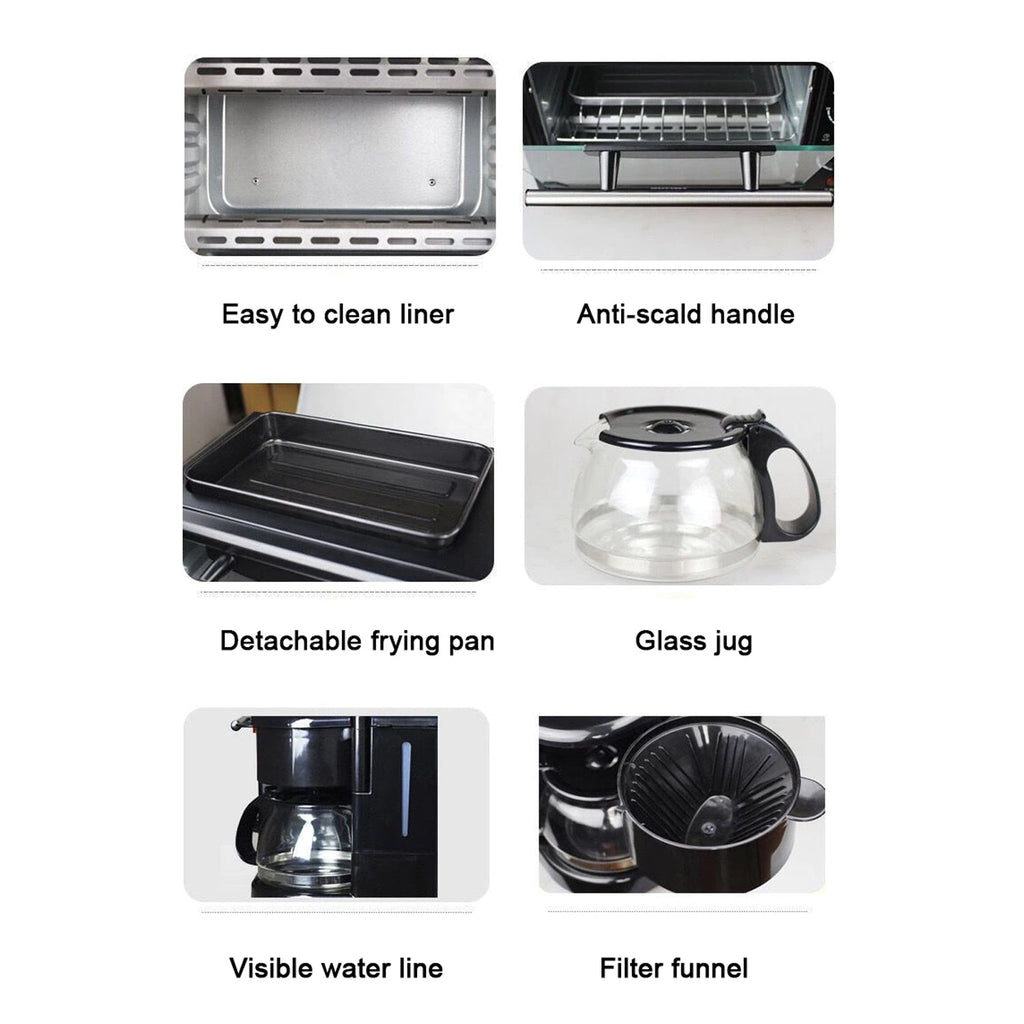 • versatile breakfast station for you that combines the toaster oven, a coffee machine and a baking tray, allowing you to make coffee, grill sausages, fry eggs, etc. while making breakfast in the morning.