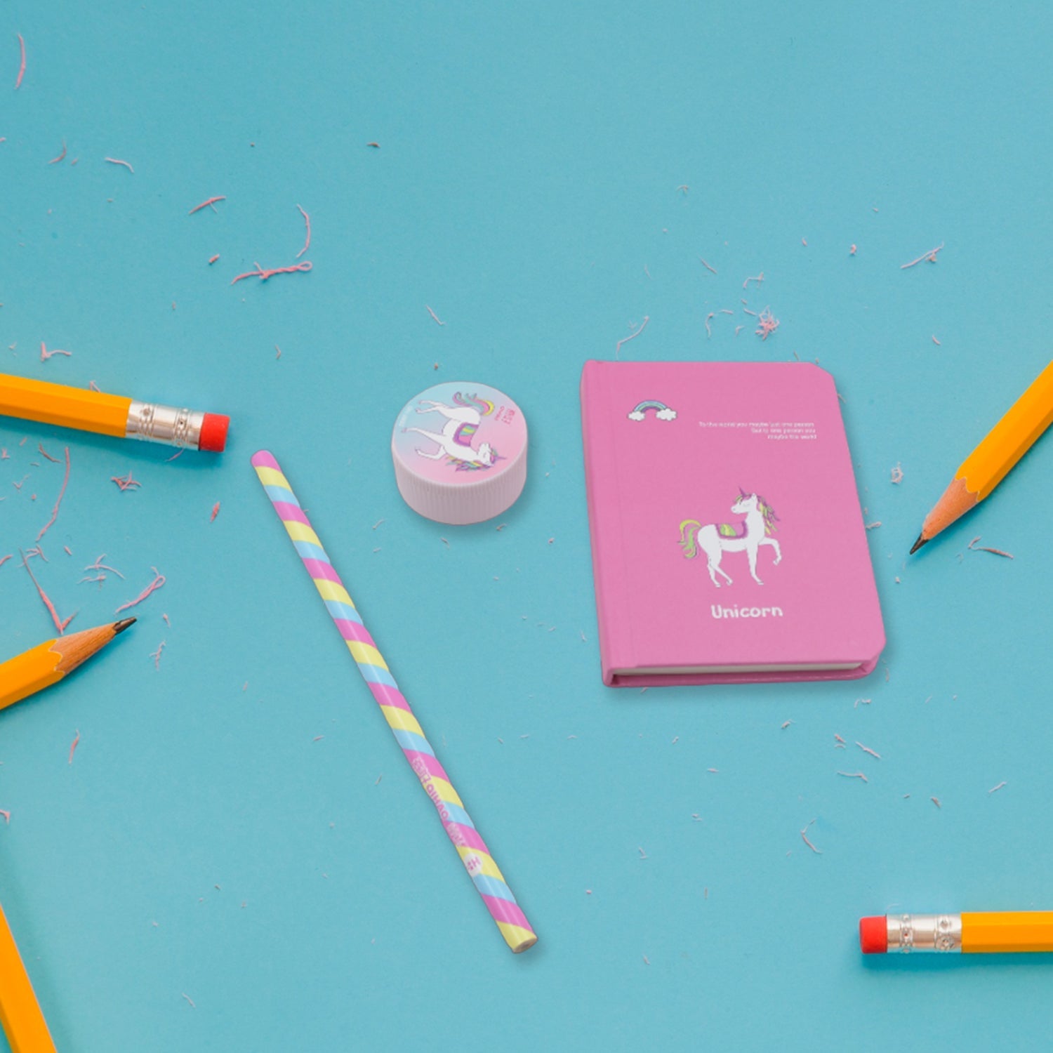 - Unicorn Stationery Set for Girls - This complete stationery set for girls contains Unicorn Theme Diary, 5 Multicolor Pencils, 1 3D Unicorn shape Eraser, 1 Crown Eraser, 1 Castle Eraser, 1 Rainbow Eraser & 1 Unicorn Sharpener.