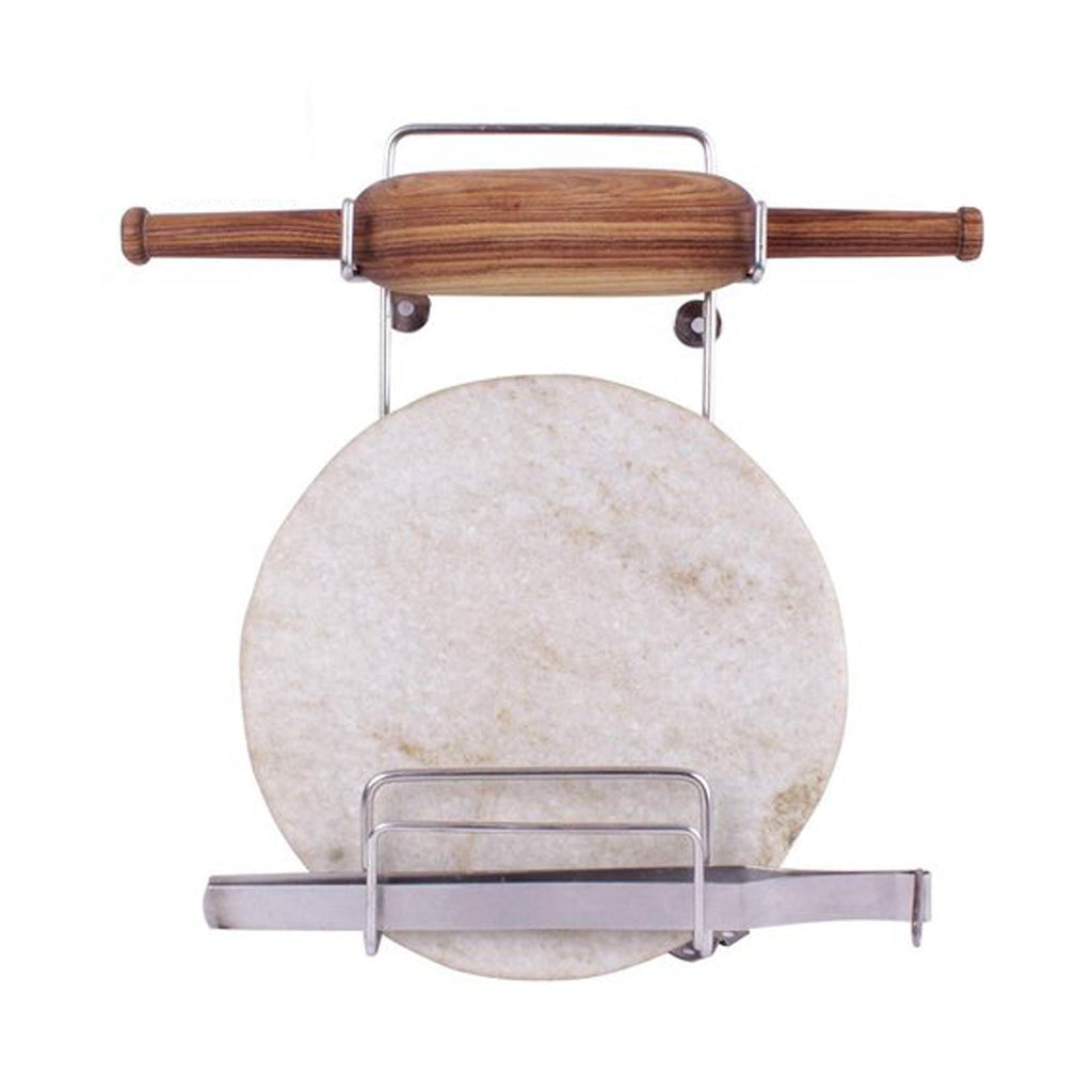Chakla Belan Stand A compact product which can be mounted on the wall and can beautifully hold the chakla and belan. This chakla stand has four hooks for hanging various kitchen Essensials. It is made of mild steel and has a high quality chrome plating finish.
