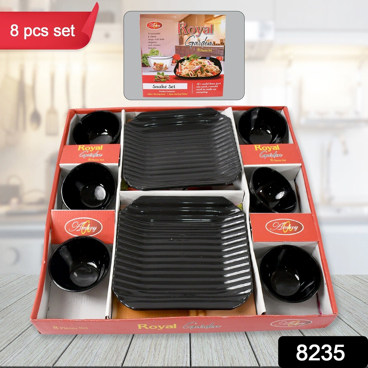 8235 Royal Garden Round Ceramic Bowl With Plastic Square shape Serving platter Portable, Lightweight Breakfast, Serving Bowl | Highly Durable Material | Ideal for Rice, Pasta, Desserts Home & Kitchen Serving Bowl & platter (8 Pcs set)