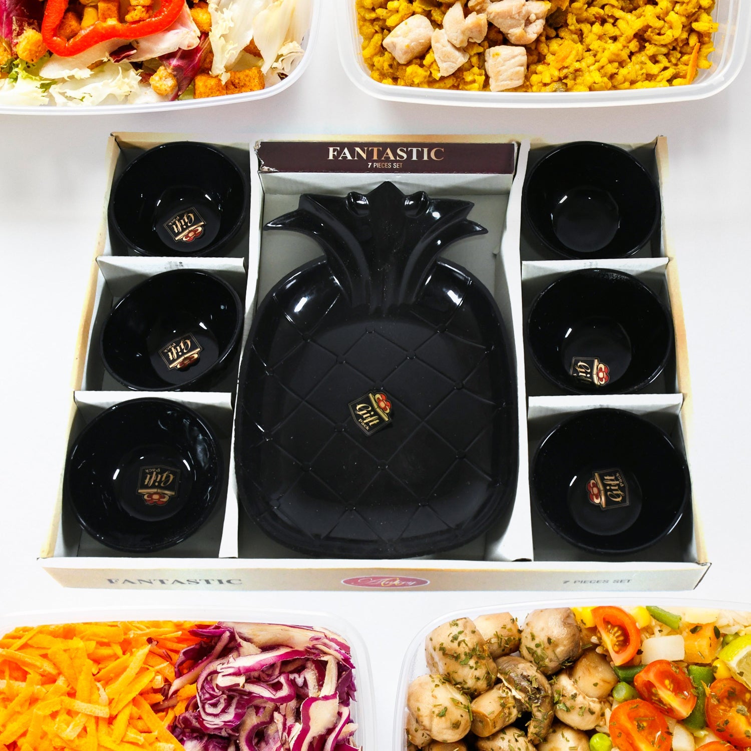 Round Ceramic Snacks Bowl With Plastic Pineapple shape Serving platter Portable, Lightweight Breakfast, Serving Bowl | Ideal for Rice, Pasta, Desserts Home & Kitchen Serving Bowl & platter (7 Pcs set)