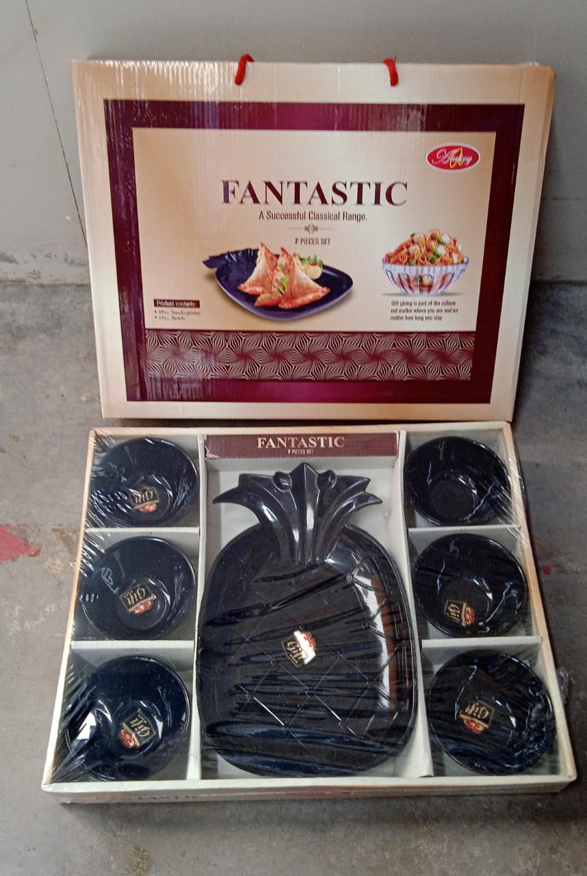 6 pcs bowl & 1 pc serving Platter Made From High-quality Ceramic Material Bowl & high quality plastic platter.